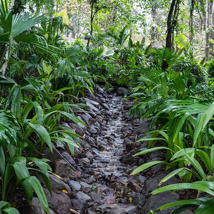 Reforestation is the most important action we can take to protect the rainforest and the wildlife that lives within it. Planting new trees reduce the amount of greenhouse gases in the air, benefiting the local climate. Most importantly, as those new trees grow, they help rebuild endangered habitats. Loss of habitats is the leading threat to the survival of animal species. The area where the resort is located had all of its trees cut down by a previous landowner to create a pasture. We have slowly and painstakingly replanted native species in the forest and created beautiful grounds that serve as a natural refuge for birds, monkeys, and sloths. We have an extensive collection of tropical plants including palms, cycads, flowering trees, and vines.