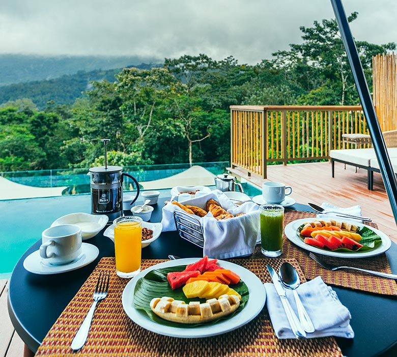 After the excitement of your day’s adventure, return to your tent to indulge in your own mineral hot springs pool. Read in the comfort of your hammock, or just unwind on the balcony overlooking the majestic Arenal volcano.